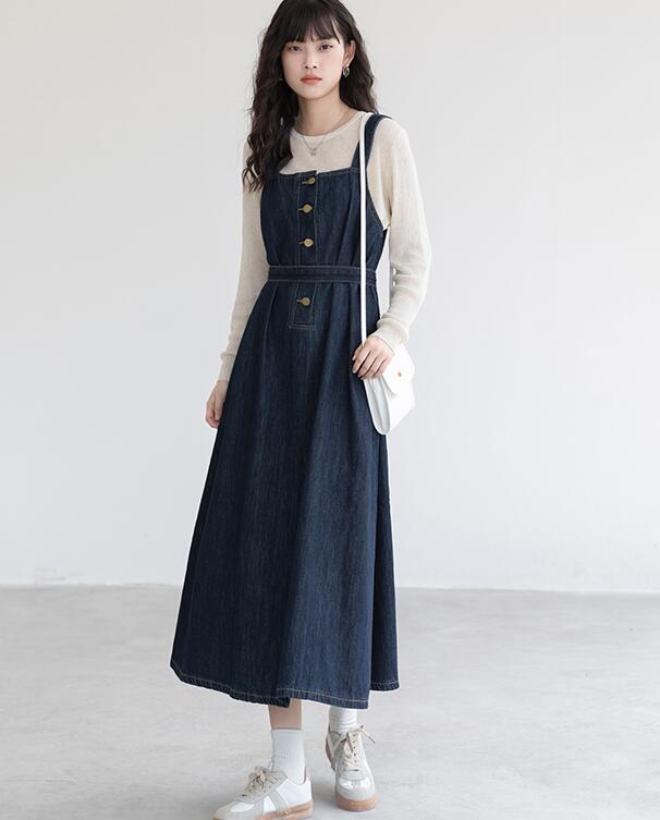 牌: other/其他尺码: S M L案: 纯色风格: 通勤通勤: 韩版领型: 其他/other腰型: 高腰衣门? 单排扣颜色分? 深蓝色袖? 其他组合形式: 单件裙型: 背带裙适用季节: 秋季年份季节: 2022年秋季袖? 无袖裙长: 中长裙流行元?工艺: 绑带 纽扣款式: 其他/other廓形: A型材质成? ?0% 其他材质10%